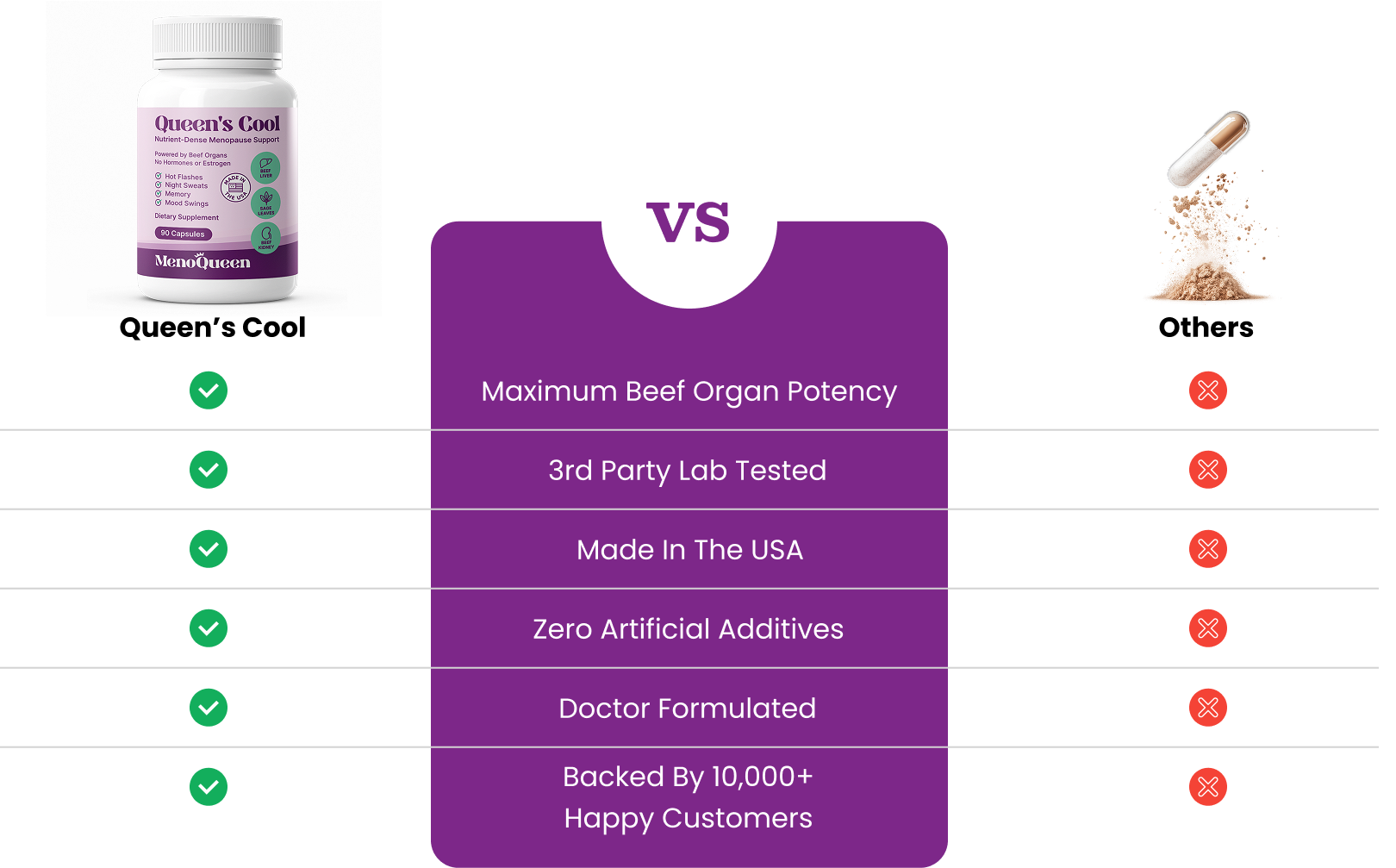 Most supplements just try to reduce hot flashes. Queen's Cool™ goes deeper—it restores the natural hormonal balance your body needs so you can feel like yourself again. And because it's made with beef organ superfoods and potent herbs, your body actually absorbs it—every single day.